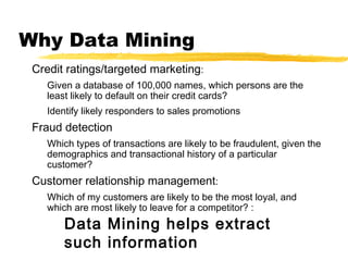 This document provides an introduction to data mining. It discusses why organizations use data mining, such as for credit ratings, fraud detection, and customer relationship management. It describes the data mining process of problem formulation, data collection/preprocessing, mining methods, and result evaluation. Specific mining methods covered include classification, clustering, association rule mining, and neural networks. It also discusses applications of data mining across various industries and gives some examples of successful real-world data mining implementations.