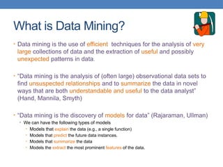 Data mining involves analyzing large data sets to extract useful patterns and summarize data in comprehensible ways, facilitating knowledge discovery for commercial or scientific purposes. It encompasses various models, including predictive, explanatory, and summarization models, using diverse data types such as numeric, categorical, and relational data. The data mining pipeline consists of steps like data collection, preprocessing, mining, and post-processing, emphasizing the importance of data quality and structured storage.