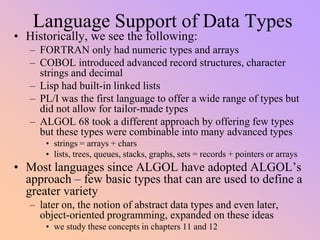 This document discusses different data types used in programming languages. It covers primitive data types implemented directly in hardware like integers and floating point numbers. It also discusses common composite types like strings, arrays, records, and enumerations. The document examines how various programming languages have implemented and extended these basic types over time to provide more powerful abstractions.
