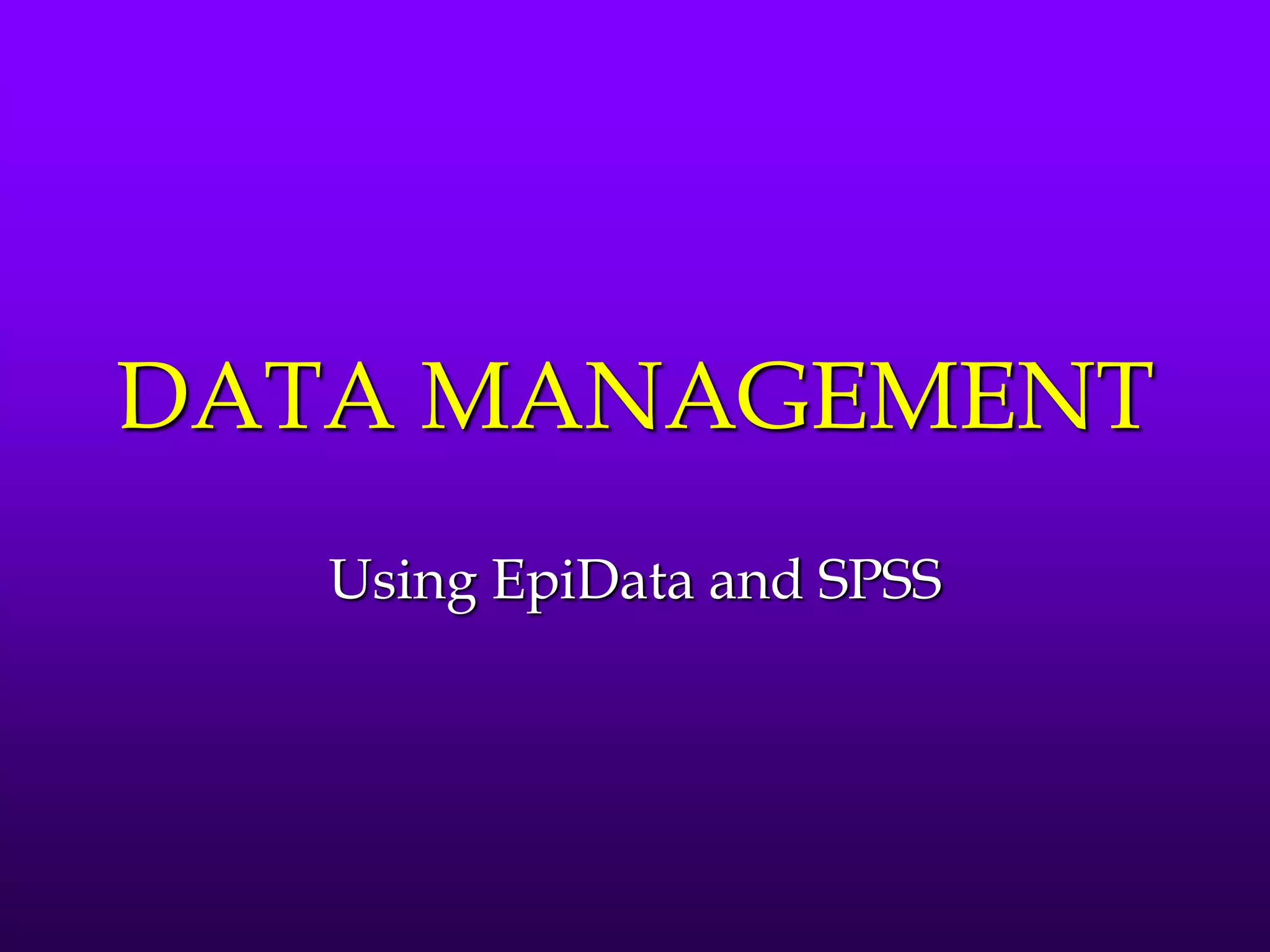 The document provides an overview of data management practices using EpiData and SPSS, highlighting essential steps such as data entry, validation, and error avoidance. It discusses different data management systems, types of data errors, and how to implement controlled data entry procedures. Additionally, it includes detailed file management, coding, and exporting/importing data for analysis, emphasizing the importance of ethical considerations in data handling.