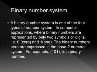 The document explains four types of number systems: binary (base-2), octal (base-8), decimal (base-10), and hexadecimal (base-16). The binary system uses two symbols (0 and 1), while octal uses digits 0 to 7, decimal employs ten digits including 0-9, and hexadecimal includes 0-9 along with letters a-f. Each system has its own application and advantages in computing and mathematics.