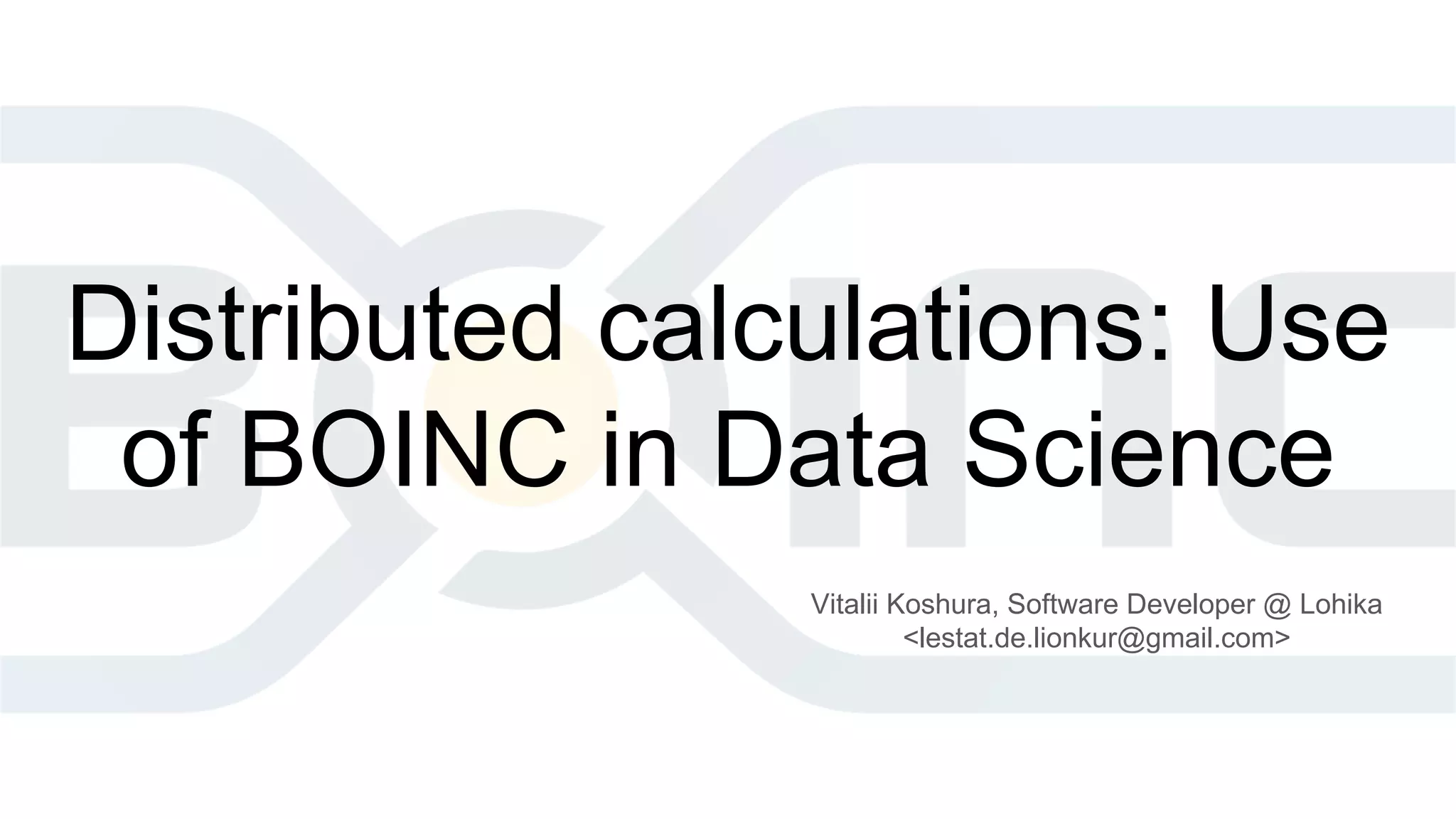 The document outlines the use of BOINC (Berkeley Open Infrastructure for Network Computing) in data science by Vitalii Koshura and David P. Anderson. It provides links for setting up BOINC projects, including server installation options, client application examples for CPU and GPU, and resources for project management. Additionally, it includes power comparisons and various support links for developers.