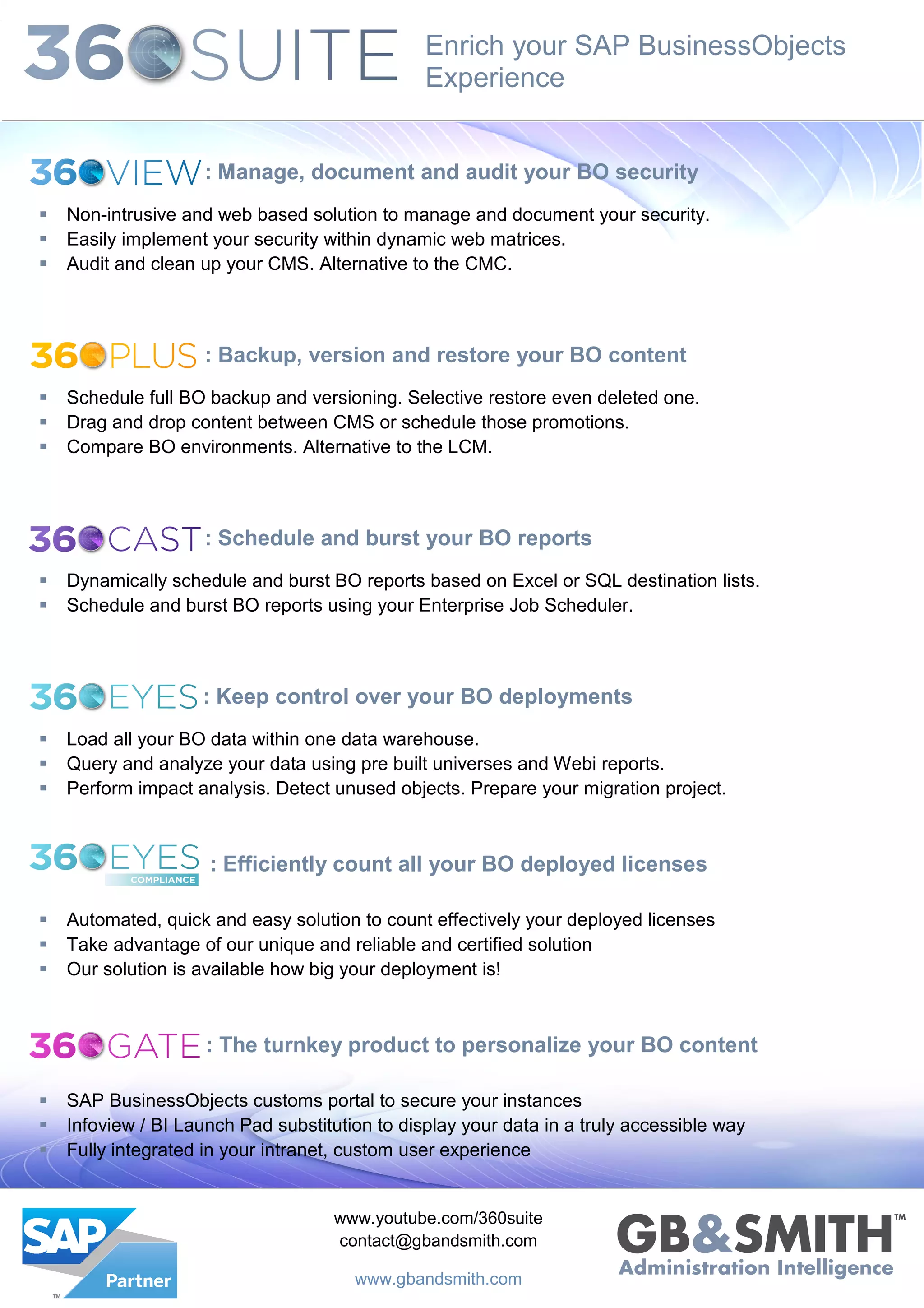 The document outlines a web-based solution designed to enhance SAP BusinessObjects (BO) experience by managing security, content backup, report scheduling, and deployments. It introduces features for documenting and auditing security, automating license counting, and personalizing BO content through a custom portal. Overall, it presents a comprehensive toolset aimed at optimizing BO management and functionality.