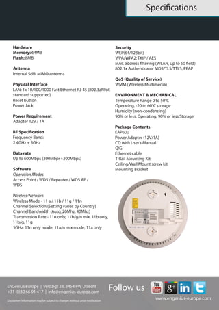The EAP600 is a dual-band concurrent ceiling mount access point offering up to 600Mbps throughput, designed for both home and small business use. It features multiple operating modes, high power transmission for extended coverage, and various security options including WPA/WPA2. The device is easy to install with a slim design that integrates well with interior spaces.