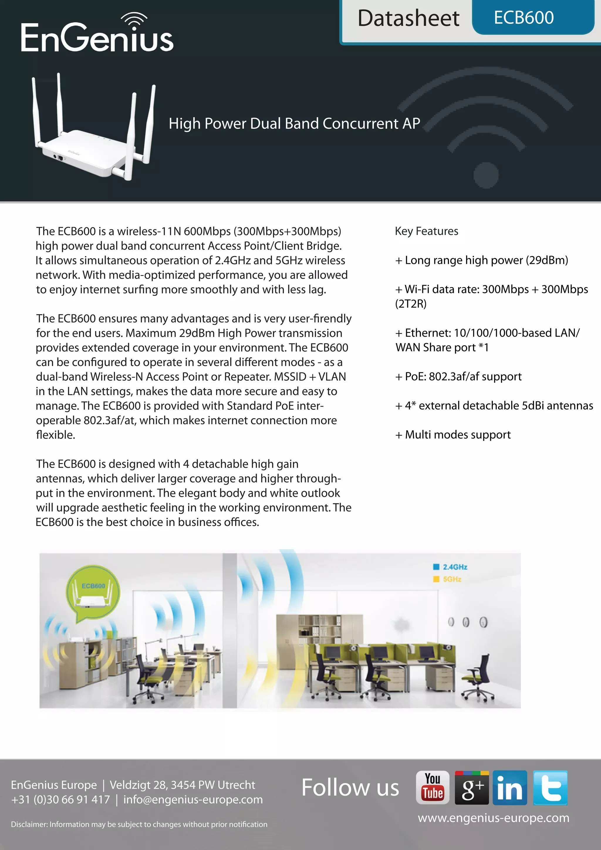 The document is a datasheet for the ECB600 wireless access point/client bridge from EnGenius Europe. It provides key details about the device such as its operating frequencies, data rates up to 600Mbps, support for 802.11a/b/g/n standards, inclusion of 4 external antennas, gigabit Ethernet port, ability to operate as an access point or repeater, security features, and environmental specifications. The ECB600 allows for simultaneous dual band wireless connectivity on both 2.4GHz and 5GHz frequencies with a range of up to 29dBm.