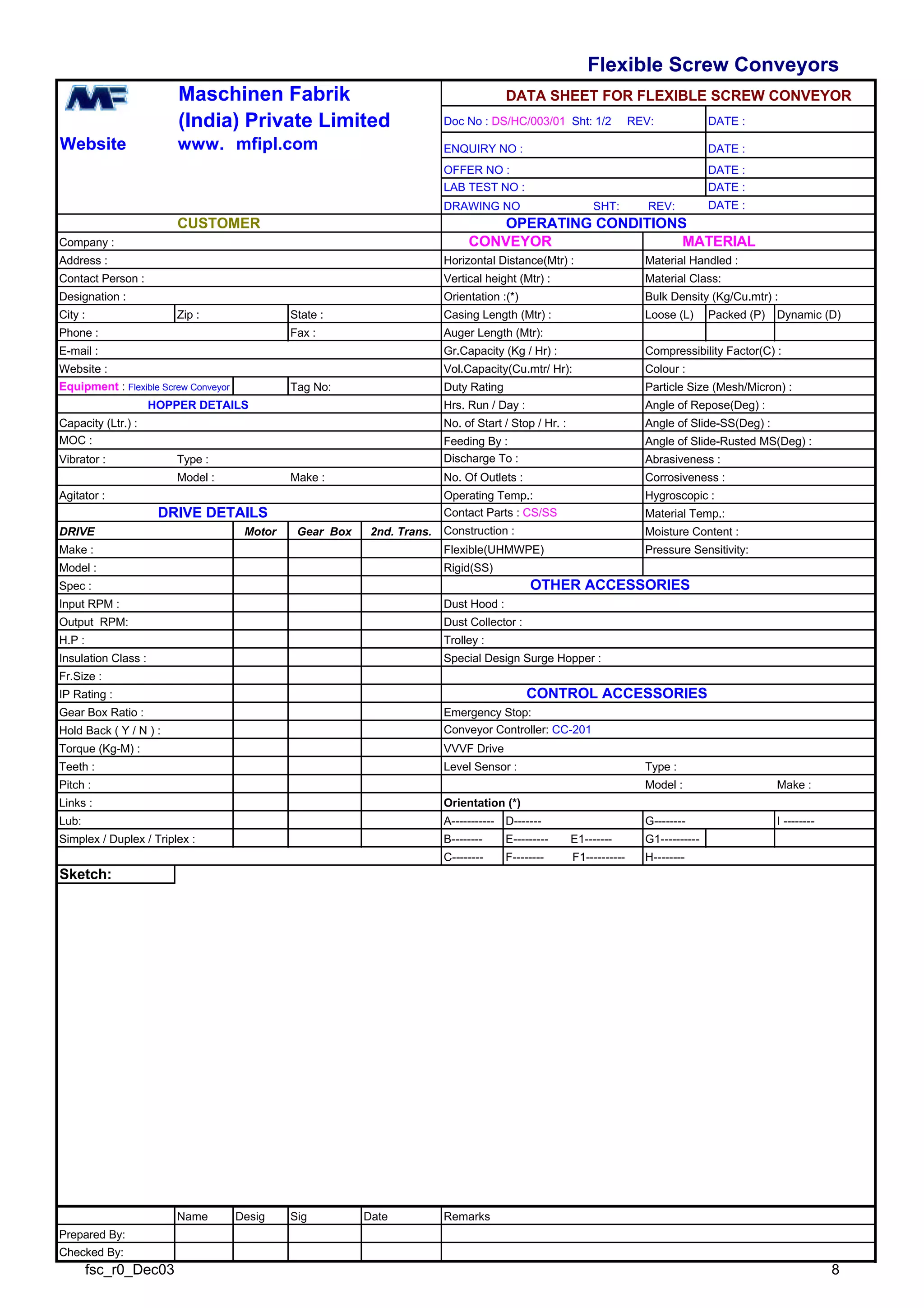 This document provides specifications for a flexible screw conveyor system. It lists details about the operating conditions including the horizontal and vertical distances, material being conveyed, flow rates, and duty cycle. It also includes dimensions of the hopper and details about the drive components, motor, gearbox, and other accessories. Control accessories like emergency stops and level sensors are specified. Finally, it contains a sketch of the conveyor orientation.
