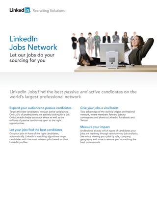 This document summarizes LinkedIn's job posting and recruiting solutions. It highlights how LinkedIn can help companies expand their candidate reach beyond just active job seekers, target the most relevant passive and active candidates, and measure the impact of job postings through analytics. It also outlines features of a LinkedIn Job Slot such as frequent job posting changes, automatic job wrapping from a company's careers site, and sending applicants straight to an applicant tracking system.