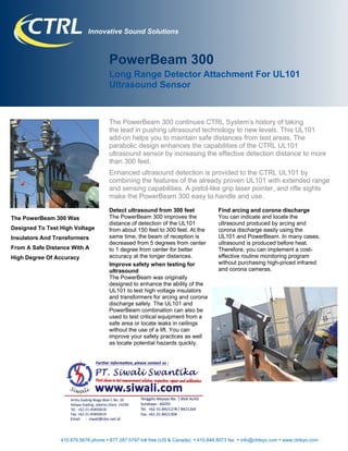 The PowerBeam 300 is an ultrasound sensor attachment for the UL101 ultrasound receiver that increases its effective detection distance to over 300 feet. It was designed to allow safer testing of high voltage insulators and transformers from a distance. Key features include detecting ultrasound up to 300 feet away with a high degree of accuracy using a laser pointer and rifle sights for pinpointing the source.