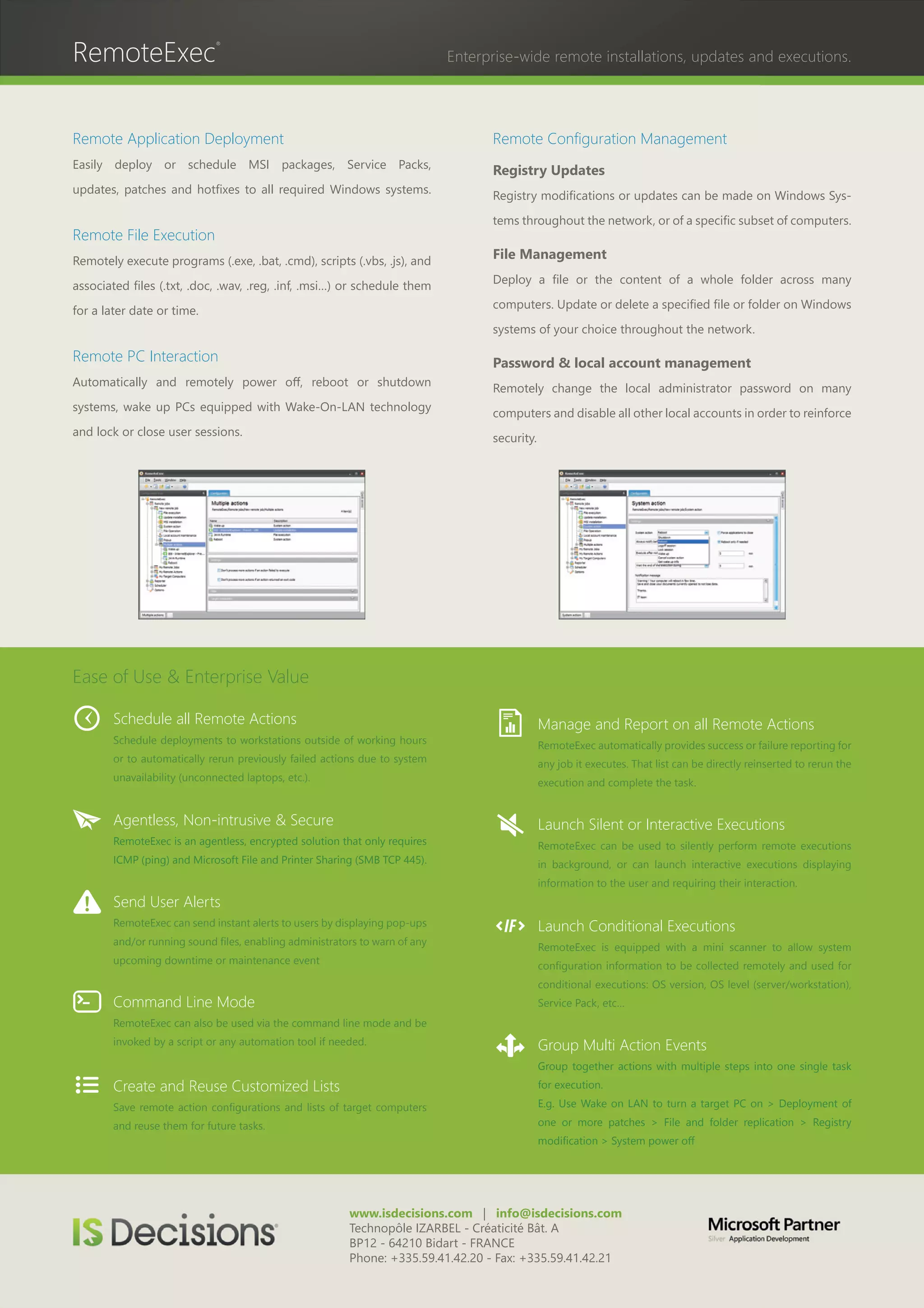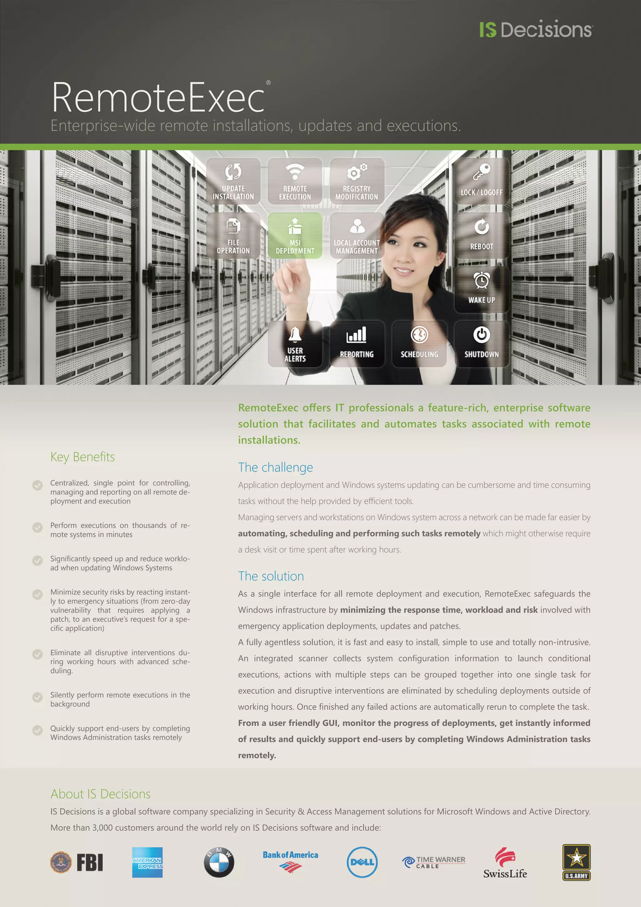 remoteexec is an agentless enterprise software solution that facilitates and automates remote installations, updates, and executions for Windows systems. It minimizes workload and security risks by allowing IT professionals to perform tasks remotely, schedule deployments outside working hours, and ensure centralized management. With features such as remote file execution, system configuration management, and user alerting, it supports thousands of systems efficiently while collecting relevant system information for conditional actions.