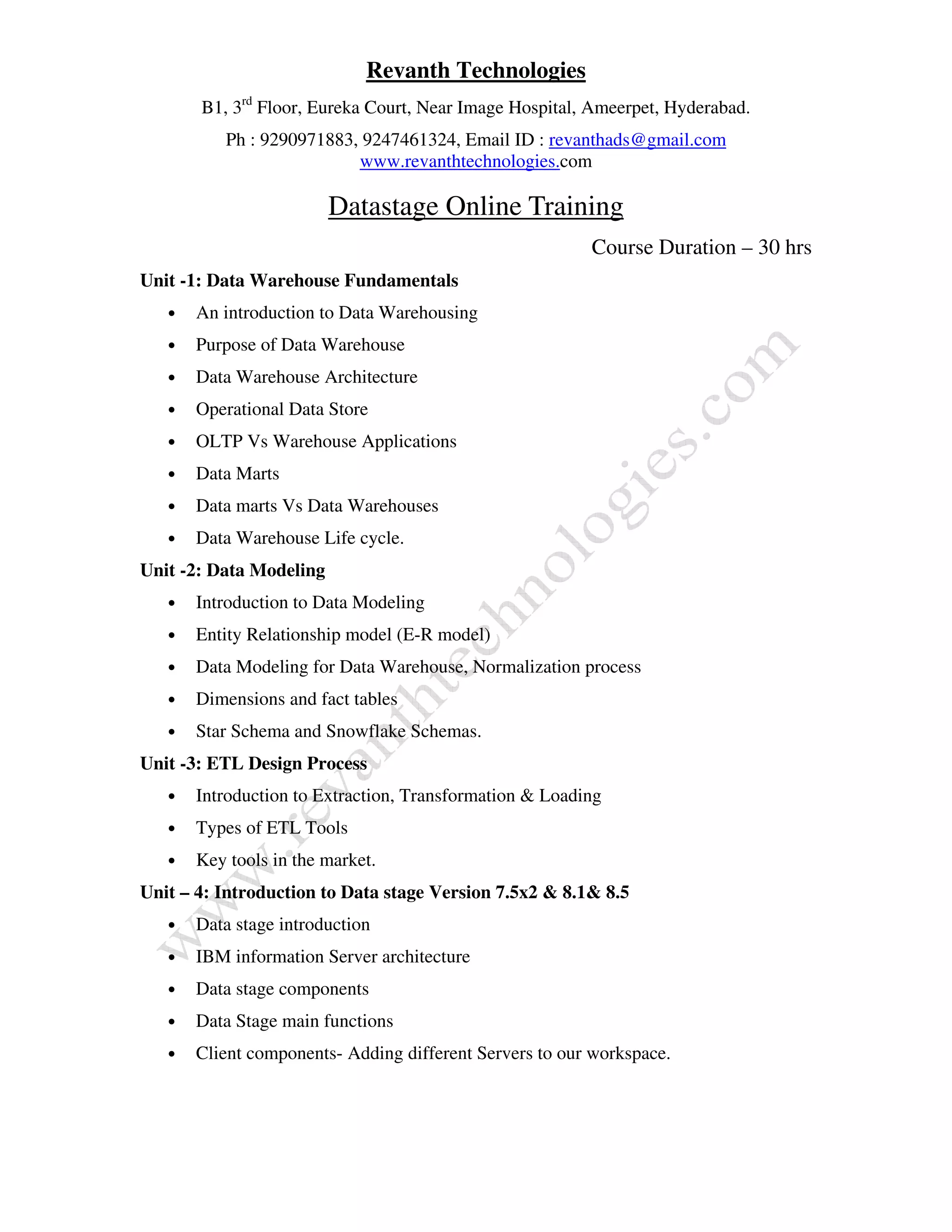 Revanth Technologies offers a 30-hour DataStage online training course covering data warehousing fundamentals, data modeling, ETL design, and various DataStage components. The course includes hands-on training with job design, execution, monitoring, and advanced processing techniques. It also highlights administration in IBM Information Server and performance tuning for data processing.