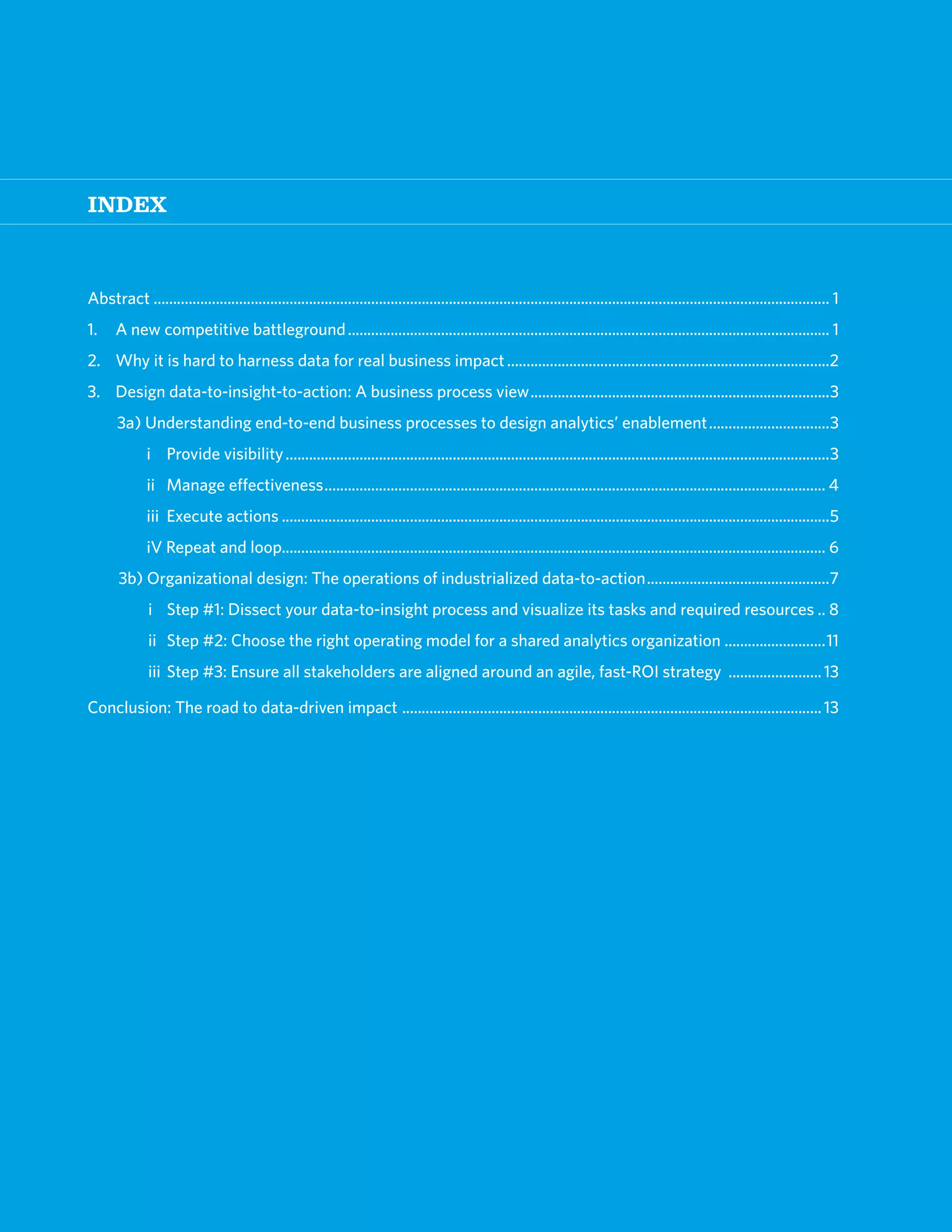 This document discusses how to deliver real business impact through analytics by taking a business process view. It recommends understanding end-to-end business processes to design analytics enablement, focusing on providing visibility, managing effectiveness, executing actions, and repeating the process. It also recommends dissecting the data-to-insight process, choosing the right operating model for a shared analytics organization, and ensuring stakeholders are aligned around an agile strategy. Taking this approach can help harness data and analytics to generate material business impact.