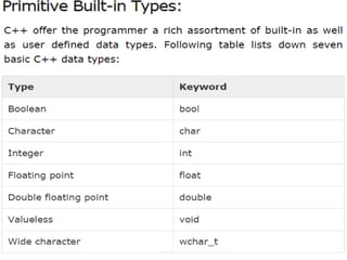 This document discusses data types in C++. It describes the three main categories of data types: primitive/fundamental types like int and char, derived types which are based on primitive types, and user-defined types created with structures. It also covers data type modifiers, constants/literals of different data types, and rules for declaring variables in C++ like their scope and naming conventions.
