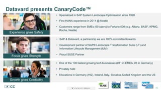 Gregor Stoeckler and Dirk Biehler of Datavard present CanaryCodeTM, a system monitoring solution specialized for SAP landscapes. CanaryCodeTM monitors over 300 key performance indicators for security, availability, and performance across SAP applications like ECC, BW, CRM and HANA. It provides real-time alerts and a knowledge base to help resolve issues. Datavard is an experienced SAP optimization partner with customers ranging from small to large enterprises.