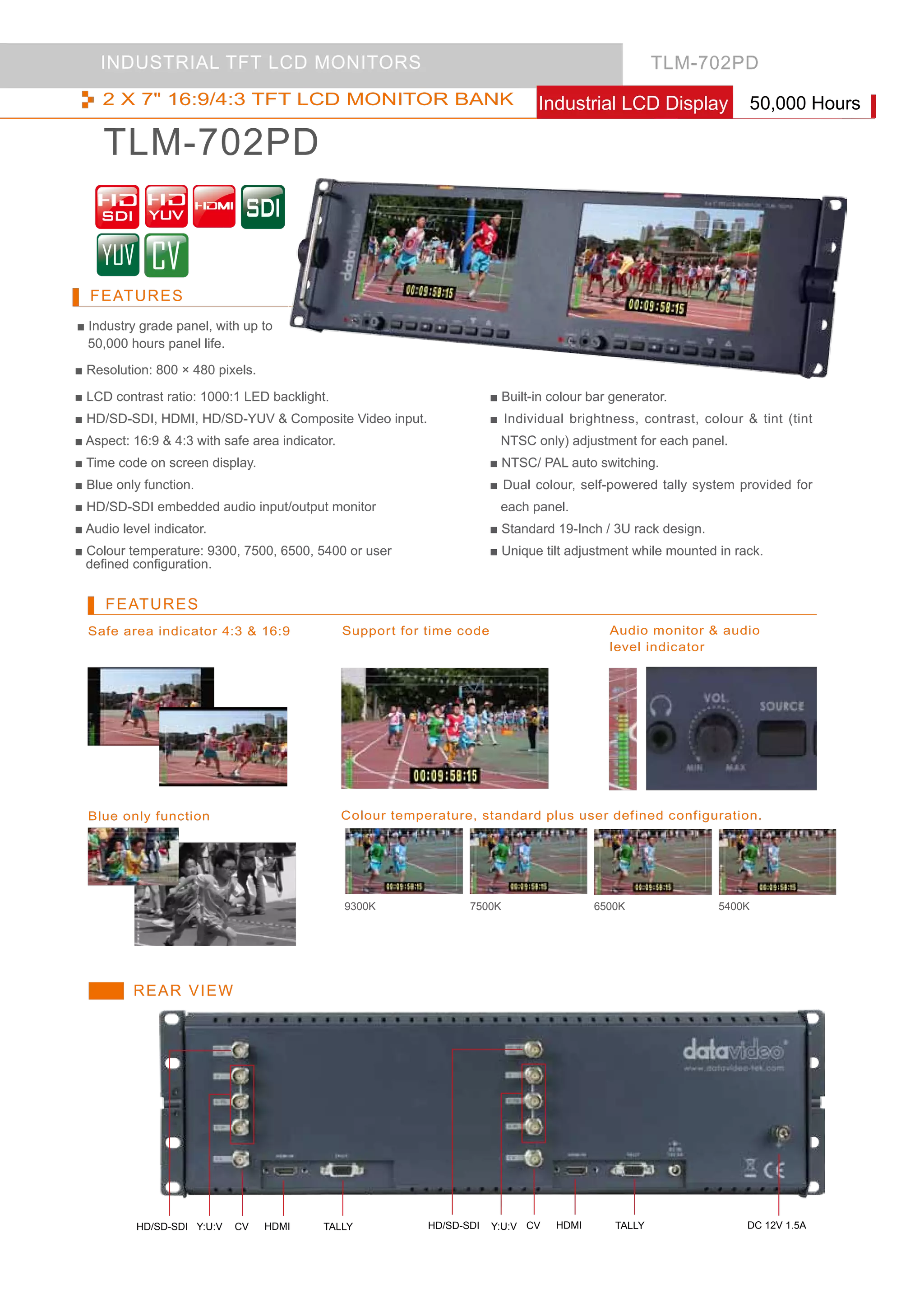 The document describes an industrial TFT LCD monitor bank with two 7-inch 16:9/4:3 displays. Key features include an industry-grade panel with a lifespan of 50,000 hours, 800x480 resolution, 1000:1 contrast ratio, HD/SD-SDI, HDMI, HD/YUV and composite video inputs, 16:9 and 4:3 aspect ratios with safe area indicators, time code display, and individual adjustment controls for brightness, contrast, color and tint for each display. The dual monitor unit has a standard 19-inch 3U rack design and tilt adjustment while mounted.