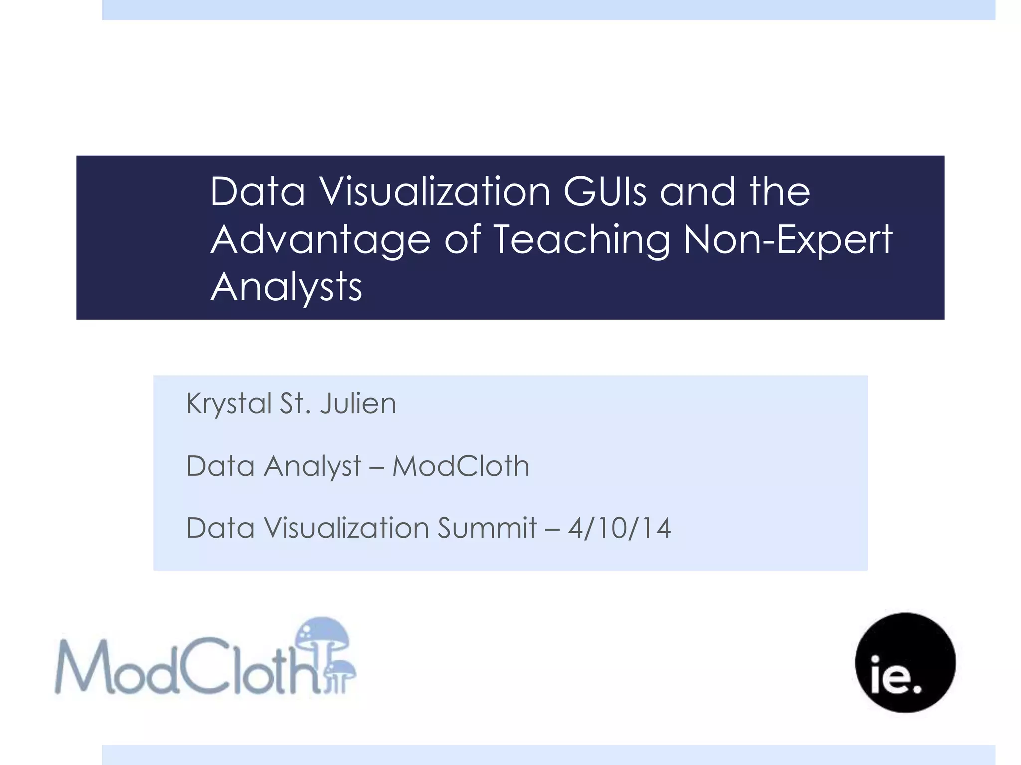 1) The document discusses teaching non-expert analysts at ModCloth to use data visualization tools like Tableau through training sessions and office hours.