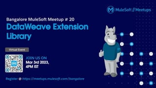 The document summarizes a MuleSoft meetup presentation about developing DataWeave extension libraries. The meetup included discussions on DataWeave language basics, the features of the DataWeave extension for VS Code like auto-completion and testing, developing DataWeave modules and mappings, packaging and deploying libraries with Maven, and a demo of the extension. The meetup encouraged participants to provide feedback and nominate themselves as future speakers.