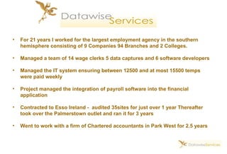 The document summarizes bookkeeping, payroll, and accounting services provided by The Angel in your back office. The services include payroll processing, VAT returns, bank reconciliation, financial reporting, and ensuring compliance. Payroll services guarantee keeping up with legislation, handling various payments and deductions, and submitting required forms. Accounts are processed either onsite or offsite using their software. Backup systems ensure daily backups with weekly offsite backups. Pricing is based on the number of transactions.