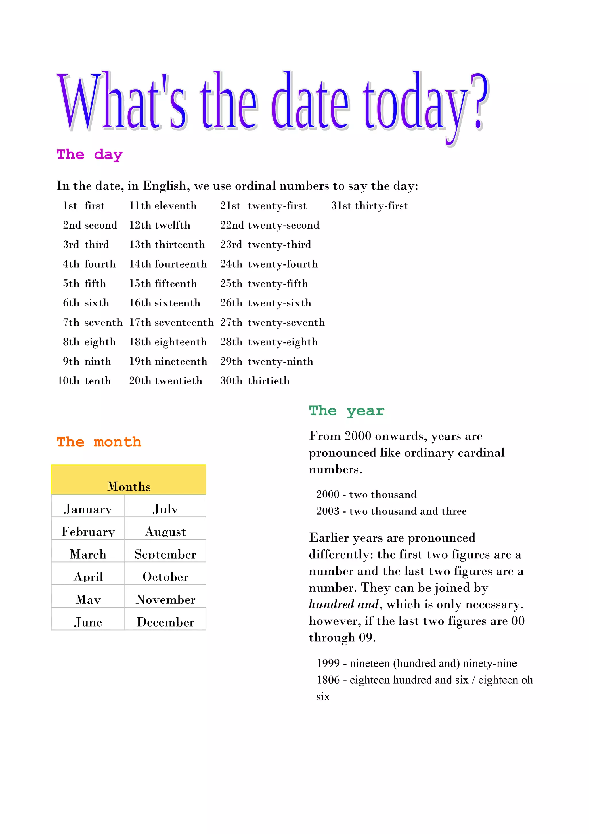 This document provides information about how to say dates in English using ordinal numbers for the day, cardinal numbers for years 2000 and later, and a hybrid system for earlier years. It lists the ordinal numbers for days 1st through 31st and the months of the year in order from January to December. Years 2000 and later are said as ordinary cardinal numbers, while earlier years are said with the first two digits as one number and the last two as another number, optionally joined by "hundred and" if the last two are 00-09.