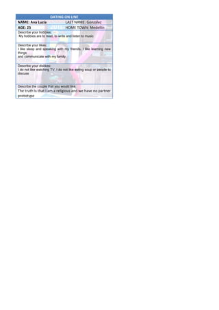 A ez is a 25-year-old woman from Medellín who enjoys reading, writing, and listening to music. She likes spending time with friends and family, learning new things, and communication. Ana dislikes watching TV, eating soup, and people who like to discuss. She is religious and does not currently have a partner.