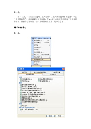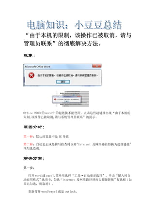 文档提供了解决在Office 2003中点击超链接时出现的提示“由于本机的限制,该操作已被取消,请与系统管理员联系”的方法。主要原因是默认浏览器设置不当或自动更正选项配置错误。解决方案包括调整Word或Excel的自动更正选项和设置默认浏览器为IE;对于Word 2007,修改注册表中的HTML类值也能解决该问题。