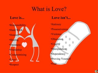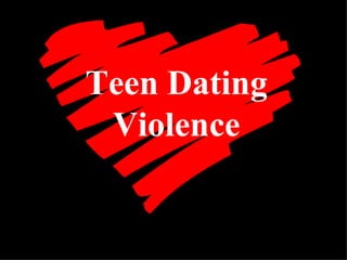 Dating violence is an attempt by one member of an unmarried couple to gain power and control over the other through threats or acts of violence. Teenagers may experience dating violence due to inexperience with relationships, peer pressure, a desire for independence, or romanticized views of love. Signs of potential dating violence include jealousy, controlling behavior, intimidation, violence, pressure, substance abuse, and blaming the victim. Anyone experiencing abuse should seek help from trusted individuals and authorities. Friends of abuse victims should offer support without judgment and help create a safety plan.