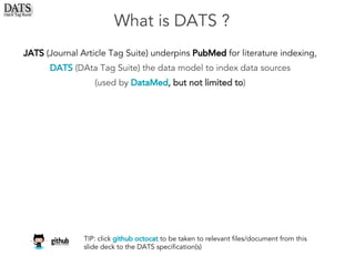 The document outlines the development of the Data Tag Suite (DATS) as part of a community initiative supported by the NIH, describing its aim to enhance the discoverability and description of datasets through a structured metadata model. It presents the iterative development process, key metadata descriptors, and the relationship between experimental details and dataset access. Additionally, the document details the integration of various metadata standards and ontologies to improve dataset indexing and accessibility for users.