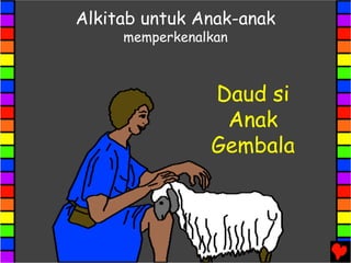 Cerita ini menceritakan kisah Daud, seorang gembala muda yang percaya kepada Allah. Daud membunuh singa dan raksasa Goliat dengan keberanian, sehingga menjadi pahlawan Israel. Namun, Raja Saul menjadi cemburu dan berusaha membunuh Daud. Daud terpaksa melarikan diri.