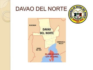 Davao Region consists of 5 provinces - Davao del Norte, Davao Oriental, Davao del Sur, Compostela Valley, and Davao City. The main industries in the region include banana production, coconut, fishing, mining, and agriculture. Davao City is the largest city in the Philippines and is known for its discipline, cleanliness, and bananas. The region was affected by deadly landslides from Typhoon Pablo in 2012.