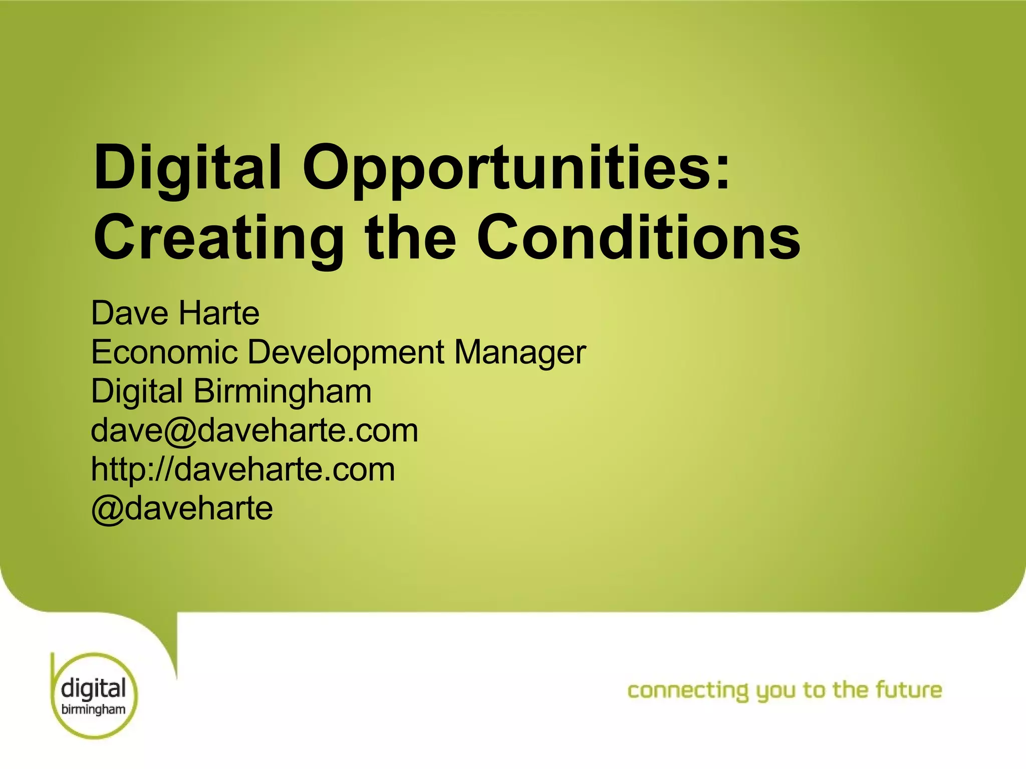 The document discusses strategies for creating economic success from digital technologies. It notes that future technology uses are unknown and policy understanding is important. It advocates bringing digital infrastructure, users, workers, investment and links between sectors to create opportunities from cognitive surplus and open data. The recommended strategy sets a roadmap for digital conditions, embraces failure, acknowledges unknowns, has influence, and is dynamic and flexible with shared ownership.