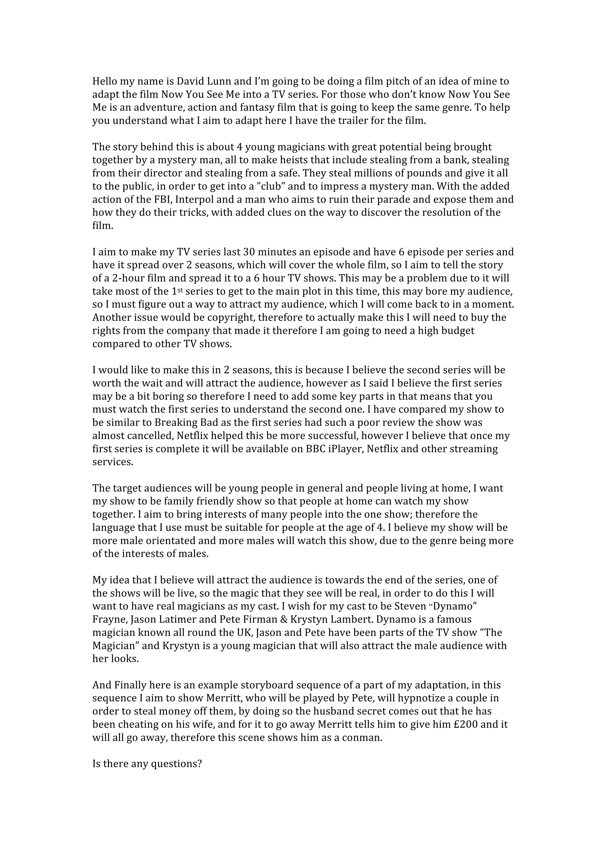 David Lunn proposes adapting the film Now You See Me into a TV series over two seasons. Each episode would be 30 minutes, with 6 episodes per season, spreading out the 2-hour film story over 12 hours total. Lunn acknowledges challenges like keeping audiences engaged over the first slow-building season and obtaining copyrights. He envisions targeting young adult and family audiences with family-friendly content. To attract viewers, one episode would feature real magic performances by celebrities like Dynamo. Lunn provides an example storyboard sequence adapting a scene from the film.