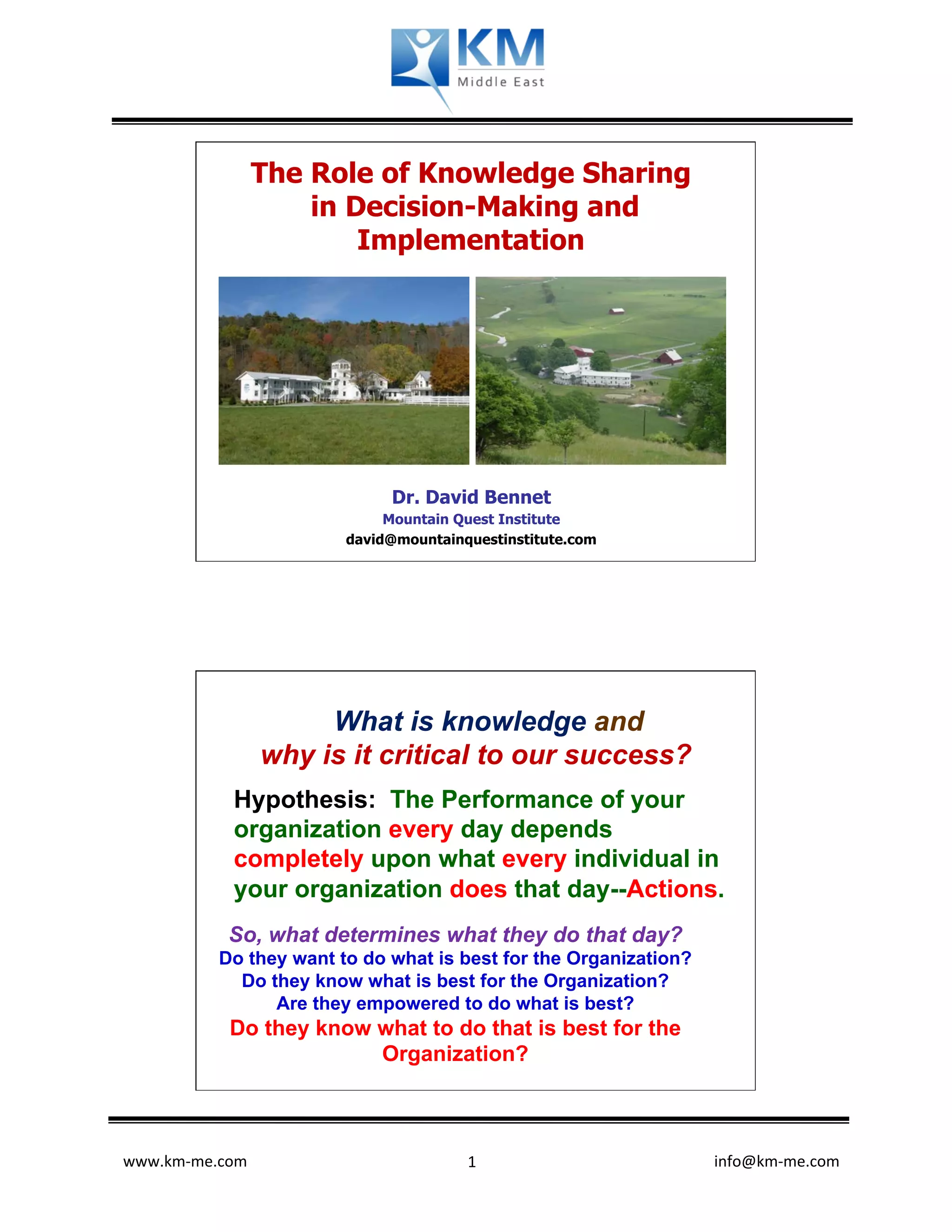 This document discusses the importance of knowledge sharing in decision-making and implementation. It covers several key topics: