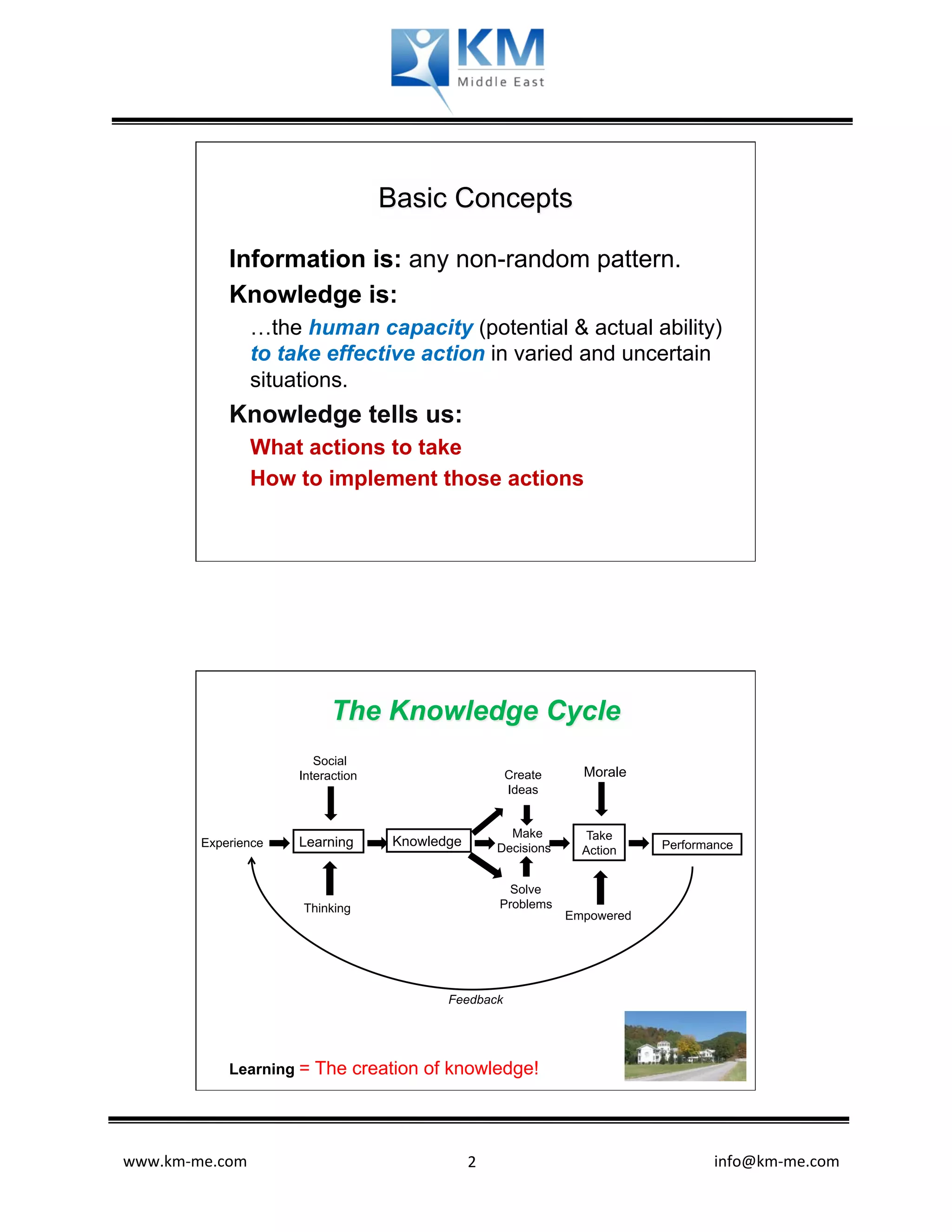 1) Knowledge is the human capacity to take effective action in uncertain situations. Sharing knowledge, which can include feelings, insights, and past experiences, is more difficult than sharing information.