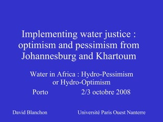 This document discusses the concepts of "hydro-pessimism" and "hydro-optimism" in discussions around water access and justice. It examines how Johannesburg and Khartoum represent both the "pessimism of intelligence" and the "optimism of the will" in their approaches. It also analyzes challenges around water pricing, inequalities, and scarcity in urban water management. Finally, it explores how conceptions of justice could influence research programs on water issues, focusing on utilitarian, Rawlsian, Marxist, and procedural views of justice.