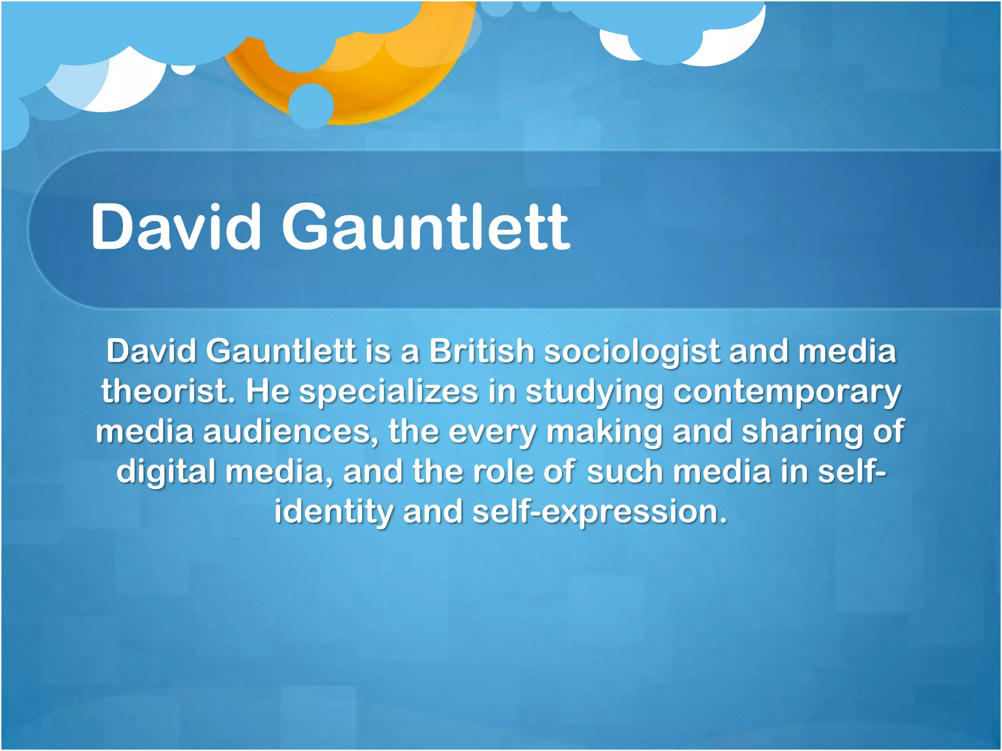 David Gauntlett is a British sociologist and media theorist who specializes in studying contemporary media audiences and the role of digital media in self-identity. He argues that classic media studies fails to account for how audiences can now also be producers through websites like YouTube. Gauntlett proposes reworking audience studies to regard media users as both producers and consumers. He believes digital media is changing experiences of media and allowing for more individualized expressions of identity that are less confined by traditional norms.