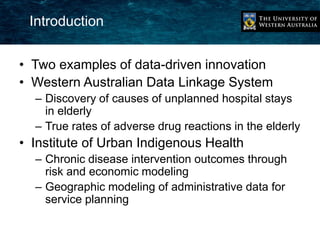 The document discusses two examples of using linked administrative data to drive innovation in aging societies. The Western Australian Data Linkage System links over 30 health databases to analyze outcomes like rates of adverse drug reactions in the elderly. Analysis showed reaction rates were double what medical coding showed and identified inappropriate medications linked to hospitalizations. The Institute of Urban Indigenous Health used linked data to measure outcomes of chronic disease interventions, calculate cost savings, and conduct geographic planning to improve access to care.