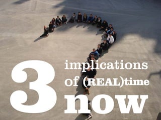 The document discusses how people are increasingly sharing information in real-time through technologies like social media and live-streaming. This is creating more data that needs to be dealt with. Real-time search aims to help integrate this increasing information overload by focusing on timeliness and providing an understanding of trending topics and interests through a real-time lens.