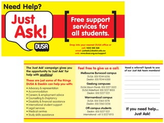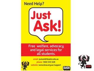 The document discusses a student perspective on support services at Deakin University. It advocates for a more proactive approach to student services where support is taken directly to students, rather than waiting for students to come to the services. It also notes that students are often more comfortable asking other students for help and that every student has different needs.