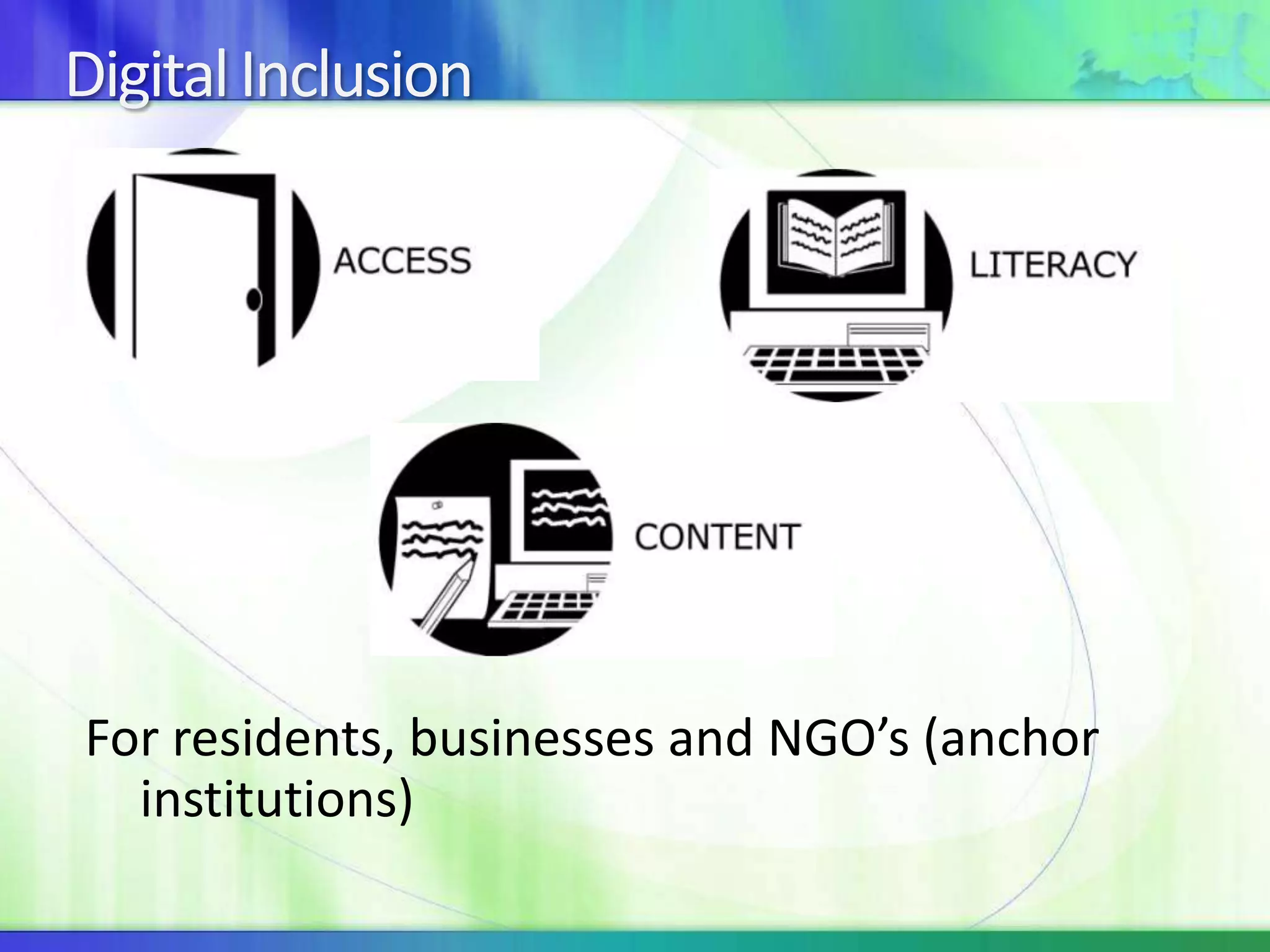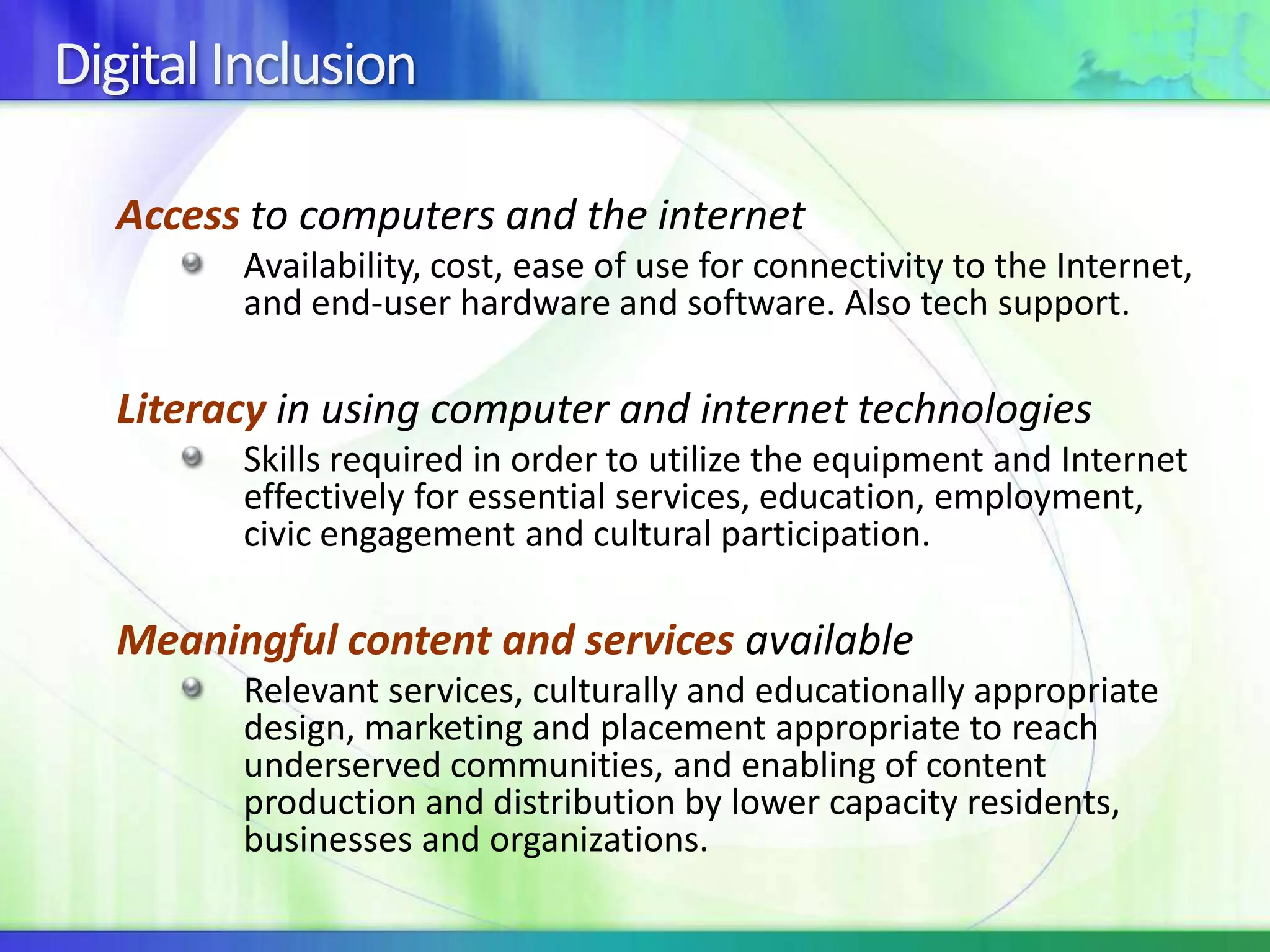 This document discusses digital inclusion and access to technology for underserved groups. It notes that meaningful access requires availability and affordability of internet connectivity and devices, digital literacy skills to use technology effectively, and relevant online content and services. While technology adoption is increasing overall, significant gaps remain for those with lower income, education levels, older age, language barriers or disabilities. Community technology centers aim to provide public access in trusted settings to help address barriers and close the digital divide.