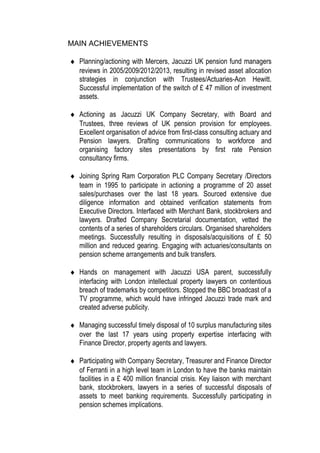 This document is a resume for David Stuart Mackinnon, an accomplished Chartered Secretary and Pension Funds Consultant with extensive experience. He has over 40 years of experience delivering company secretarial and legal services to boards of directors in financial services and manufacturing. Some of his main achievements include successfully managing pension fund reviews and asset allocation strategies, organizing company reviews and communications, and participating in over 20 asset sales and purchases totaling over £50 million.