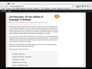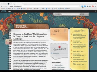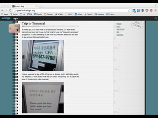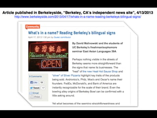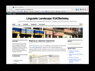 This document discusses the concept of linguistic landscape, which refers to the languages used in public signage and displays in a given area. It provides context on the origins and development of linguistic landscape studies, which draw from fields like sociolinguistics, urban studies, and cultural geography. The document outlines how the languages present or absent in an area's public spaces can influence perceptions of ethnic group identities and power dynamics. It also notes that signs and language have agency and consequences, affecting and reflecting social actions. The document aims to introduce linguistic landscape concepts and questions to consider in language education.