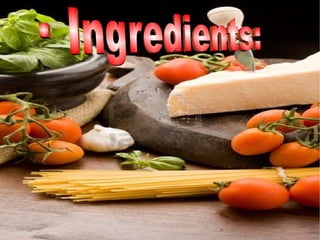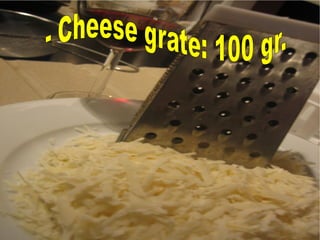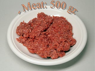This recipe involves preparing ingredients like meat, bacon, onion and garlic by chopping and cutting them, then grilling them. Next, boil spaghetti and spread the grilled ingredients and spaghetti on a baking dish along with tomato sauce. Finally, grate cheese over the top and bake, then serve on a plate.