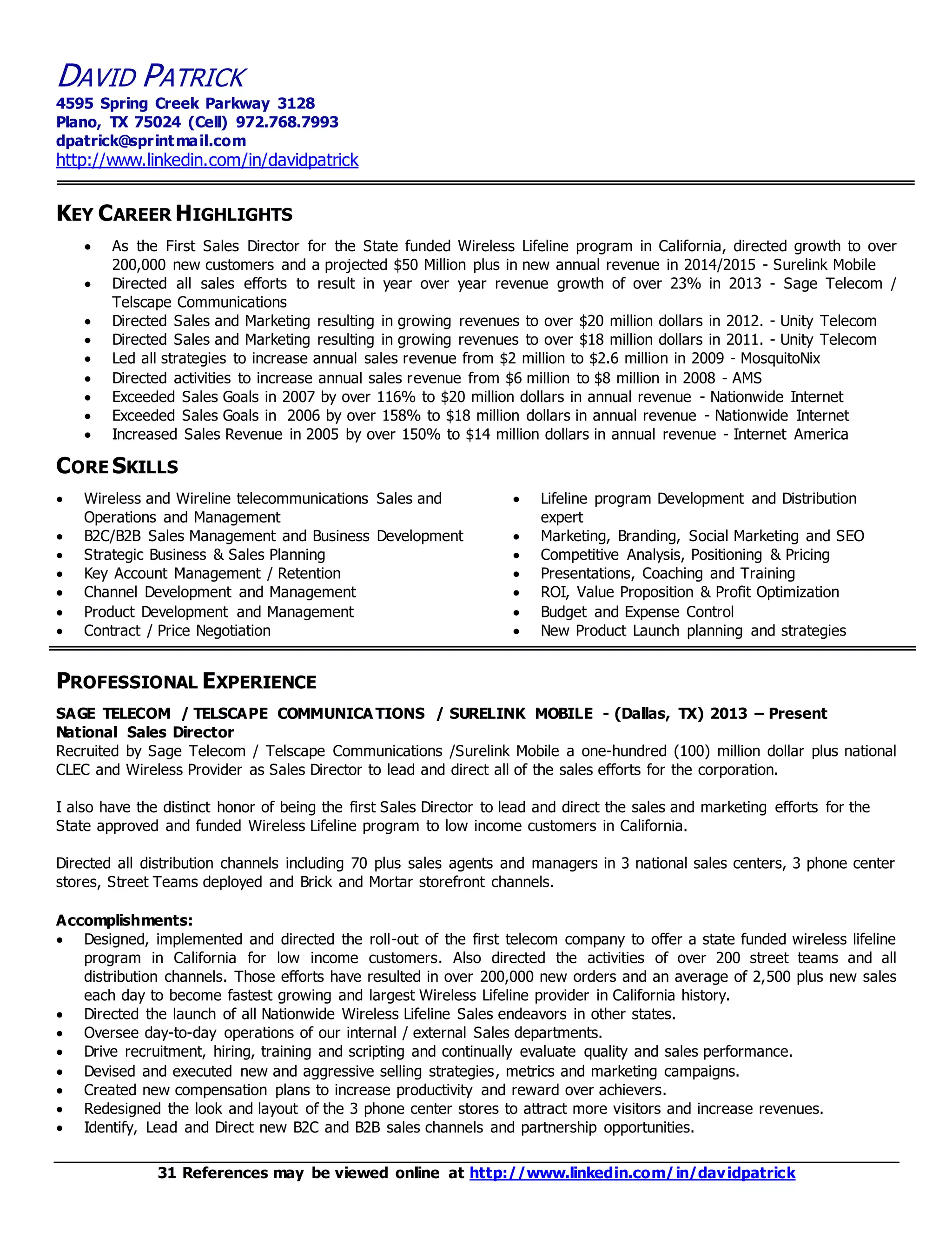 David Patrick has over 20 years of experience in sales and marketing leadership roles in the telecommunications industry. He has consistently exceeded sales goals and grown company revenues over 150% in some roles. His experience includes directing sales and marketing efforts for companies providing wireless, wireline, and internet services generating over $200 million in annual revenues. He has expertise in product development, pricing strategies, and developing new distribution channels.