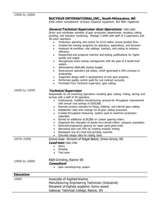 David Konkol has over 20 years of experience managing precision manufacturing operations and implementing process improvements. He is currently the Project Manager/Production Leader at Waukesha Engine/GE Power and Water, where he has generated $2.2 million in annual cost savings through alternate manufacturing methods and continuous improvements. Prior to that, he held several supervisory and management roles at other manufacturing companies, including Bucyrus International and Harley Davidson, where he increased productivity, quality, and throughput. Konkol has a strong background in manufacturing engineering, quality control, budgeting, and developing training programs.