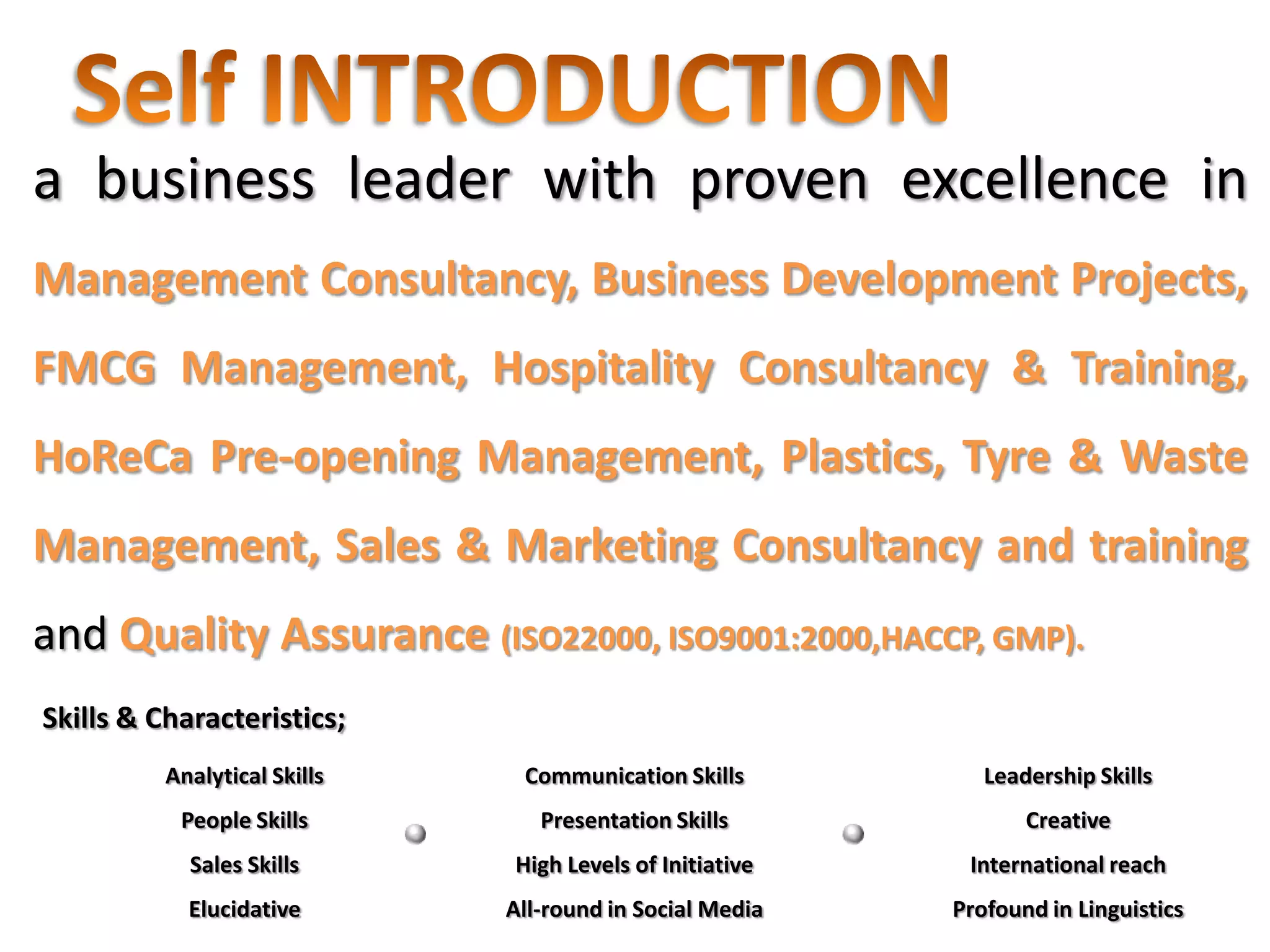 The document discusses the experience and skills of an individual with expertise in management consultancy, business development, FMCG management, hospitality consultancy and training, pre-opening management, plastics, tyre and waste management, sales and marketing consultancy and training, and quality assurance. They have analytical, communication, leadership, people, and presentation skills as well as initiative, international reach, elucidation abilities, and proficiency in social media and linguistics. Their experience includes positions such as product manager, project manager, business developer, HACCP, pre-opening, F&B training projects, general manager, chef de cuisine, and sous chef.
