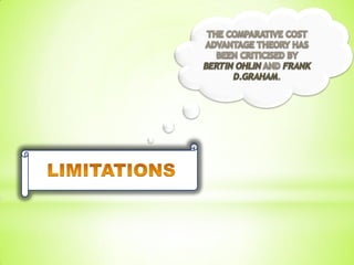 The classical theory of international trade was formulated by Robert Torrens, David Ricardo, and John Stuart Mill. Their theory relates to comparative advantage. Ricardo's theory states that countries will export commodities where they have a comparative advantage and import commodities where they have a comparative disadvantage. Ricardo used a numerical example to illustrate how trade benefits both Portugal and England even when Portugal has an absolute advantage in both goods - by specializing in their comparative advantages, both countries can consume beyond their production possibilities.