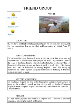 David is a 12-year old boy from Ribadesella, Spain who enjoys music, football, spaghetti, and peach juice. He has been playing the piano for four years and likes the band Evanescence. In his free time, he does homework, plays with his brother or computer, and spends money on candies and sandwiches. He is looking to make new friends between ages 11-13 and wants to learn English and French.