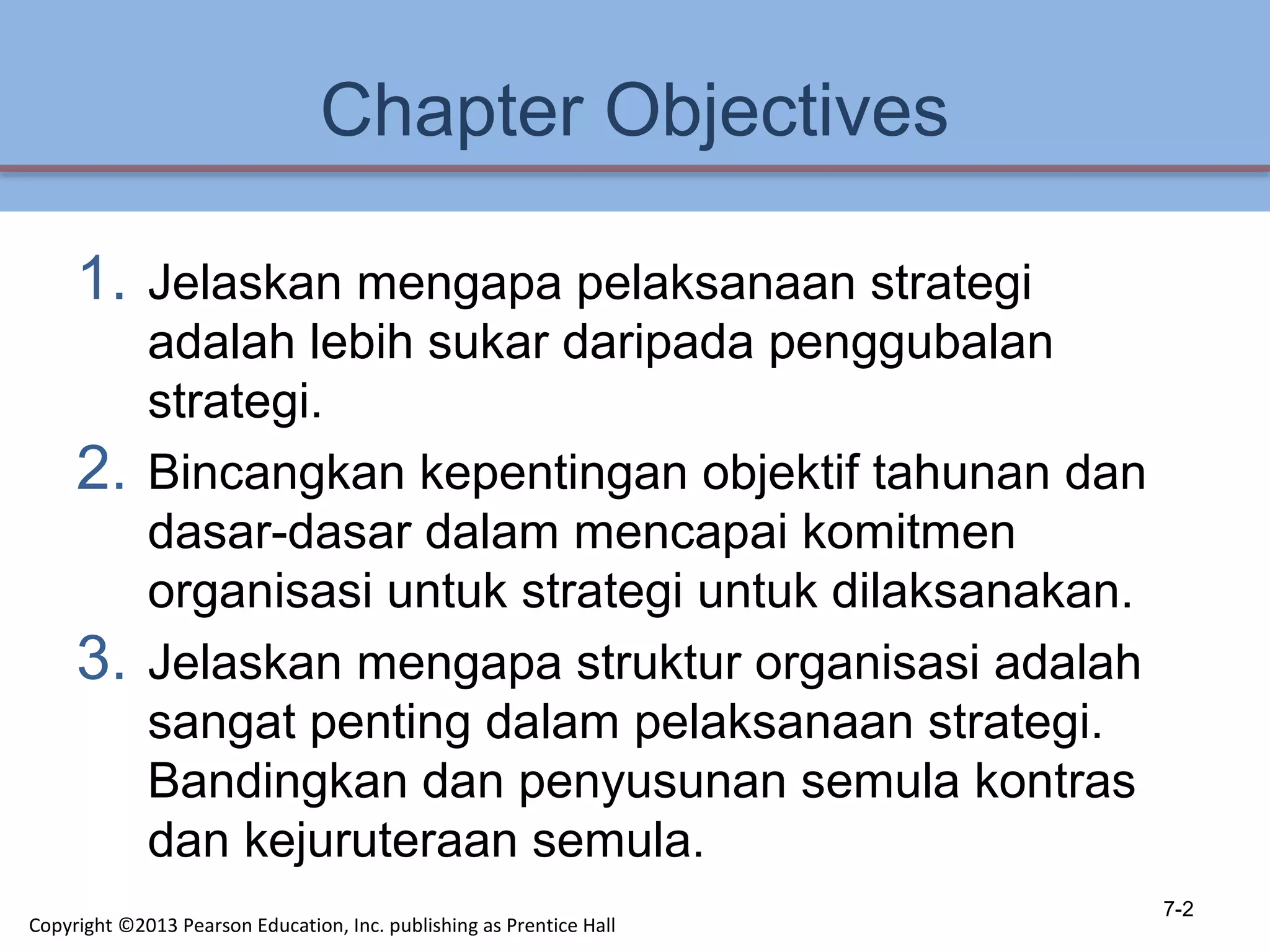 Dokumen ini membincangkan pelaksanaan strategi dan kepentingannya dalam pengurusan serta operasi organisasi. Ia menyentuh isu-isu seperti objektif tahunan, dasar, peruntukan sumber, dan struktur organisasi yang perlu seiring dengan strategi. Juga dibentangkan cara untuk mengadaptasi budaya organisasi bagi menyokong strategi baru dan menangani konflik dalam pelaksanaan.