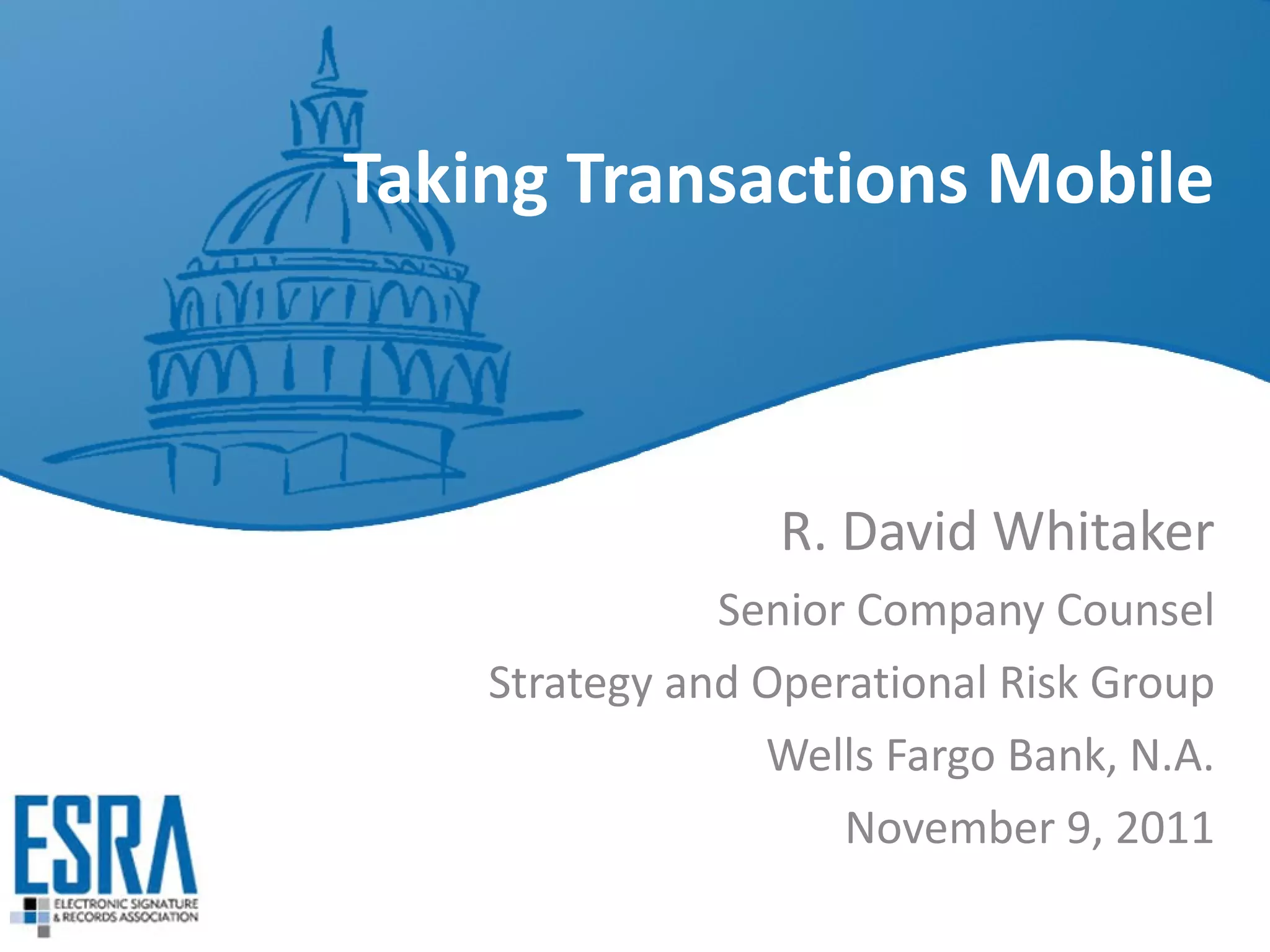 This document discusses legal and compliance considerations for delivering transactions and obtaining signatures on mobile devices. It addresses the need to meet legal requirements, obtain informed consent, and properly manage records. Key requirements include obtaining consent for electronic delivery, ensuring the full document is displayed, allowing retention of copies, and tracking authentication, storage, and transmission of records. The design process for mobile apps must consider issues like version control, online/offline operation, security, and special deployment concerns to properly deliver records and signatures.