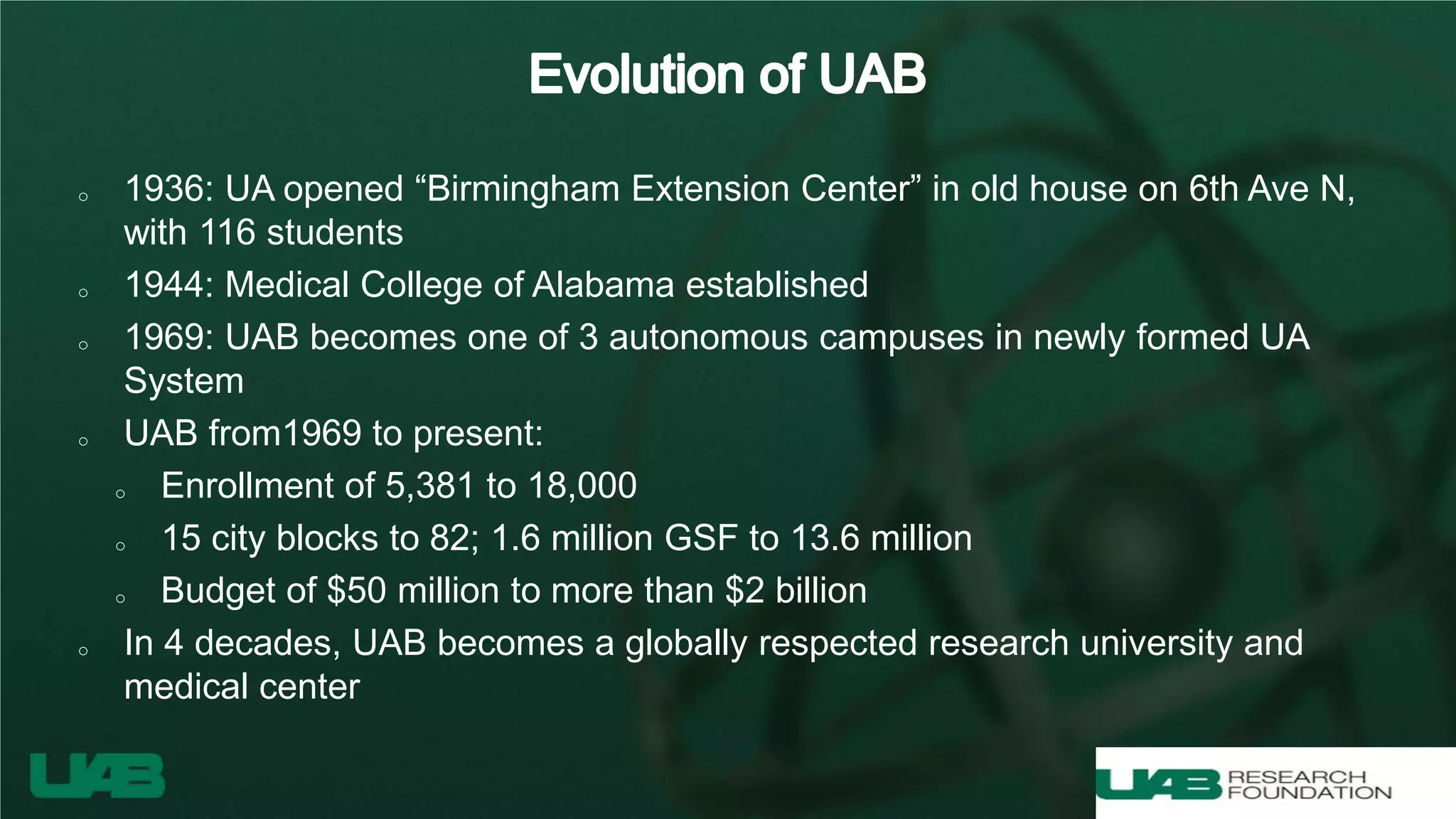UAB has grown tremendously since its founding in 1936 from a small extension center with 116 students to a major research university with over 18,000 students. It has become a top research institution, ranking 30th in the US for federal research funding and in the top 100 universities worldwide for life sciences. UAB is a key driver of the regional economy, with an annual economic impact of $4.6 billion and over 23,000 employees, the largest in Alabama. UAB is working to further commercialize its research through partnerships, funding programs, business incubation, and growing its entrepreneurial ecosystem.