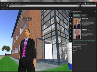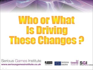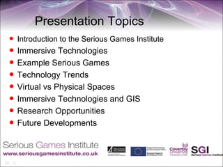 The document discusses immersive technologies and how they are integrating physical and virtual worlds. It covers topics like the Serious Games Institute, example serious games, technology trends predicting more personalized and ubiquitous immersion, and how physical and virtual spaces are blurring together. A key point is that physical spaces currently lack the intelligence for personalized, persistent relationships that virtual spaces provide, but that is changing as immersive technologies become embedded in shared physical environments.